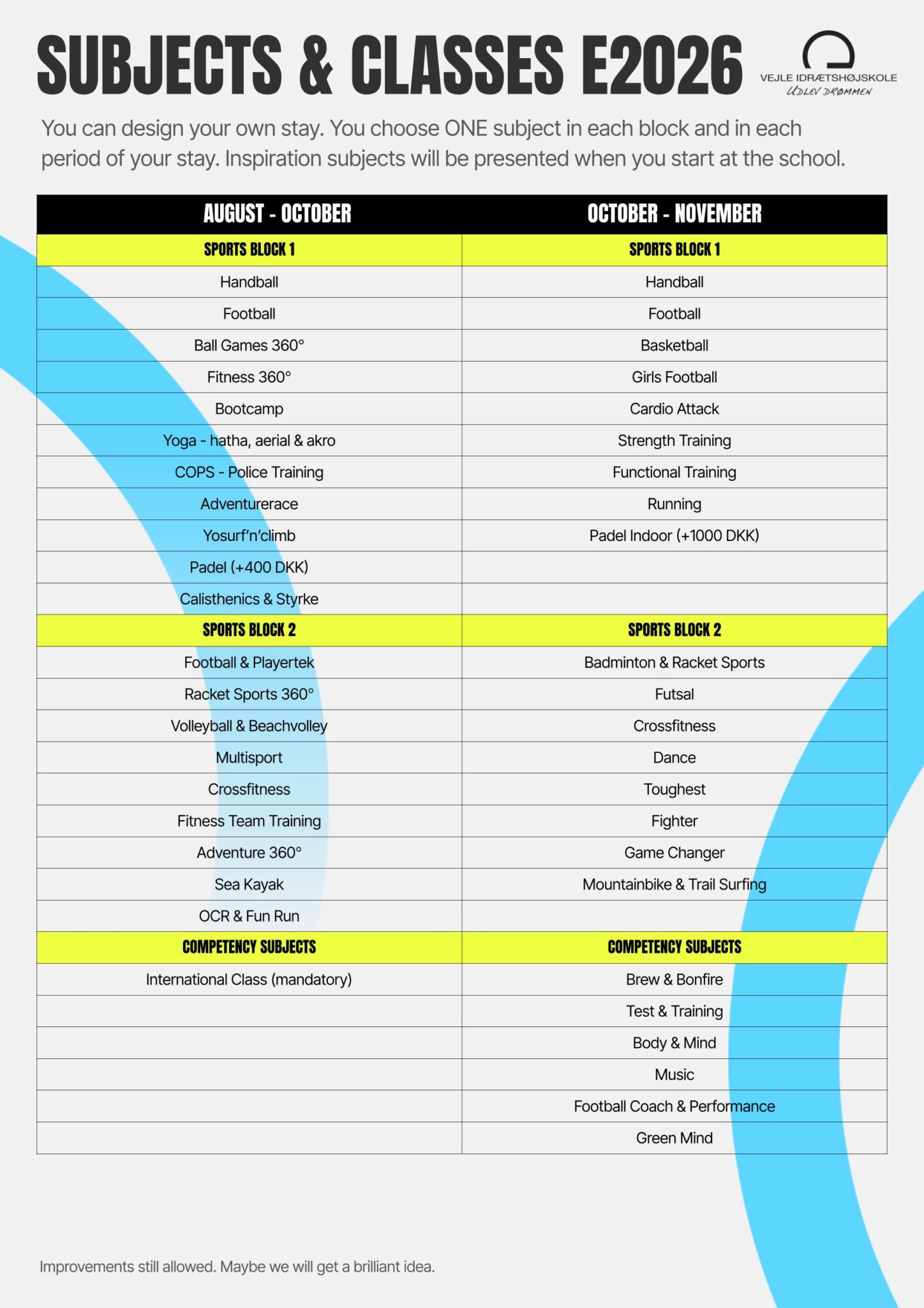 In week 38 you will choose between different offers: Adventure trip to Chamonix, Surf trip to Morocco, the Camino in Spain or staying at the school in Denmark, where there will be different activities.