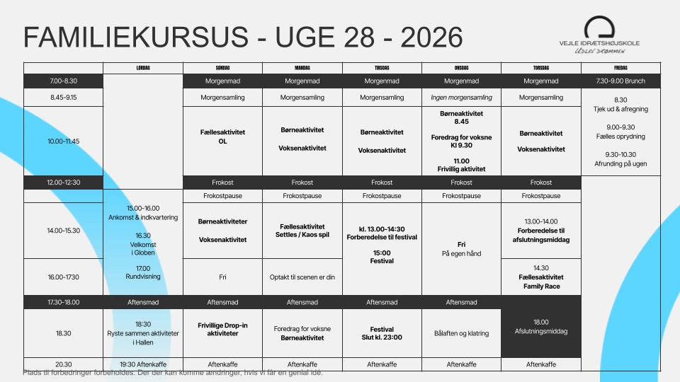 Til de voksne tilbyder vi også en masse forskellige idrætsaktiviteter. Aktiviteterne kan ses på skemaet med mulighed for små ændringer undervejs. Du skal først vælge din aktivitet, når du er på kurset. Ugen byder desuden også på foredrag for de voksne, mens vi laver aktiviteter med børnene, der får mulighed for at få relationer på tværs.