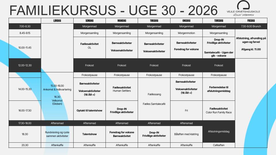 Til de voksne tilbyder vi også en masse forskellige idrætsaktiviteter. Aktiviteterne kan ses på skemaet med mulighed for små ændringer undervejs. Du skal først vælge din aktivitet, når du er på kurset. Ugen byder desuden også på foredrag for de voksne, mens vi laver aktiviteter med børnene, der får mulighed for at få relationer på tværs. Du behøver ingen forkundskaber – du skal bare have lyst og mod til at være med. Mere information følger her på siden.